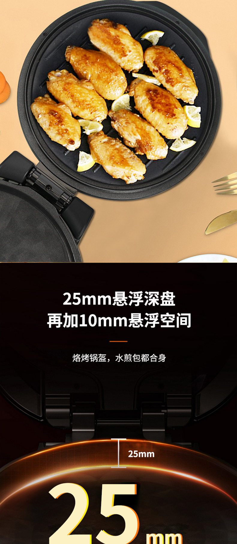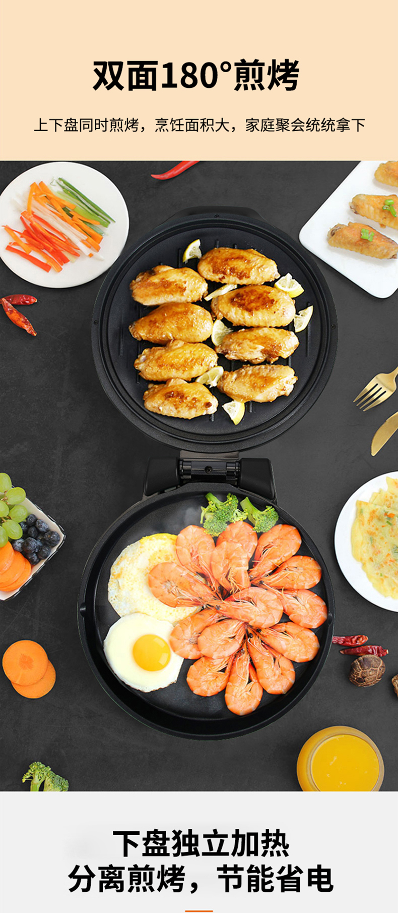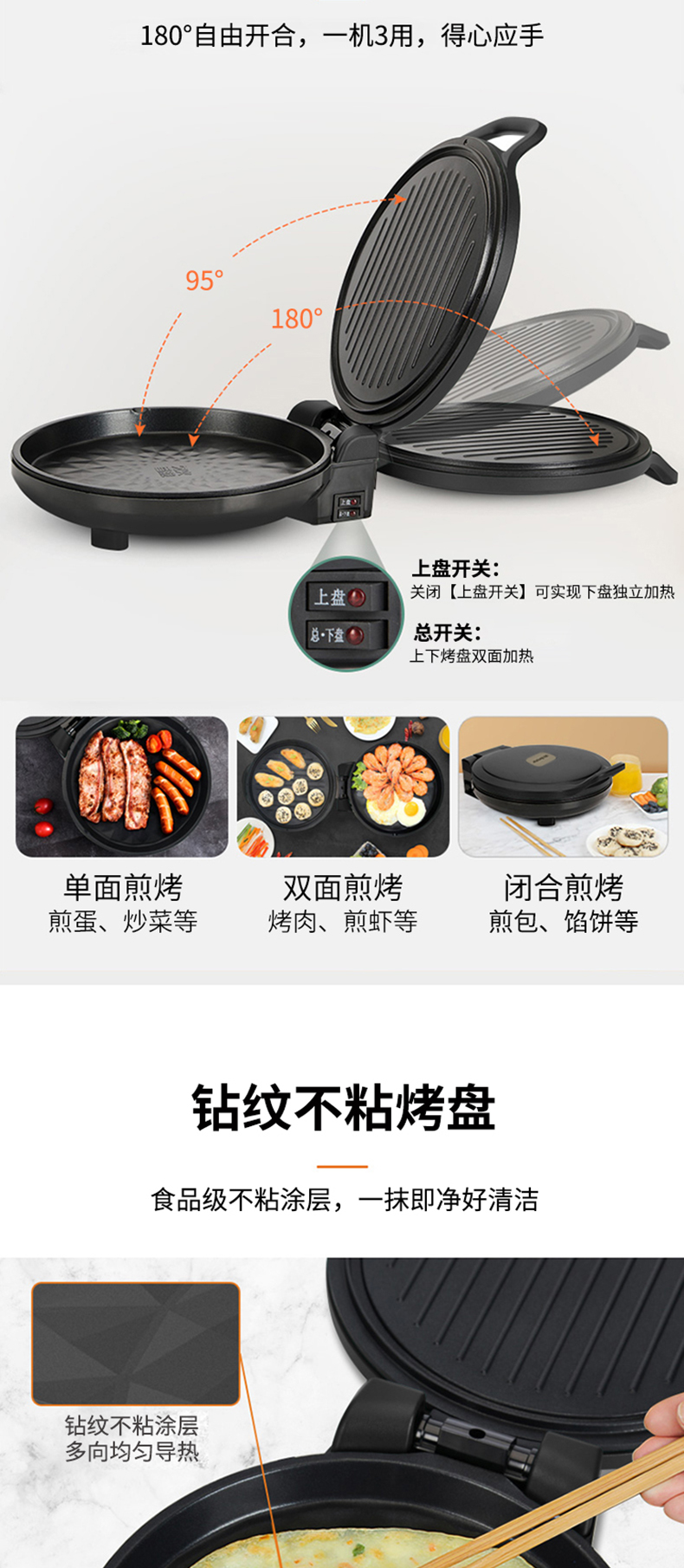 1、双面180°煎烤,上下盘同时煎烤,烹饪面积大; 2、下盘独立加热,上盘95°和180°开启,分离煎烤; 3、钻纹不粘烤盘; 4、竖形导油筋,轻松滤出多余油脂; 5、健康不粘,易清洗;