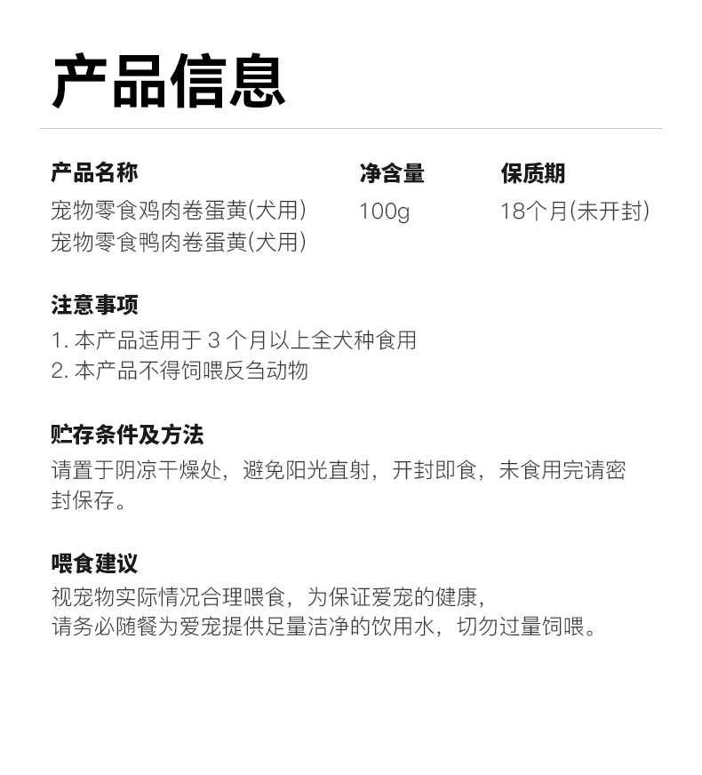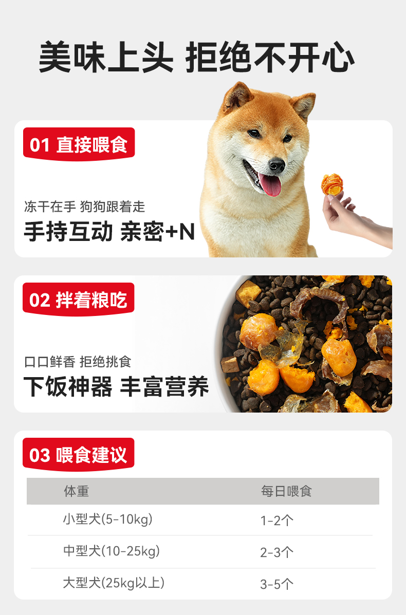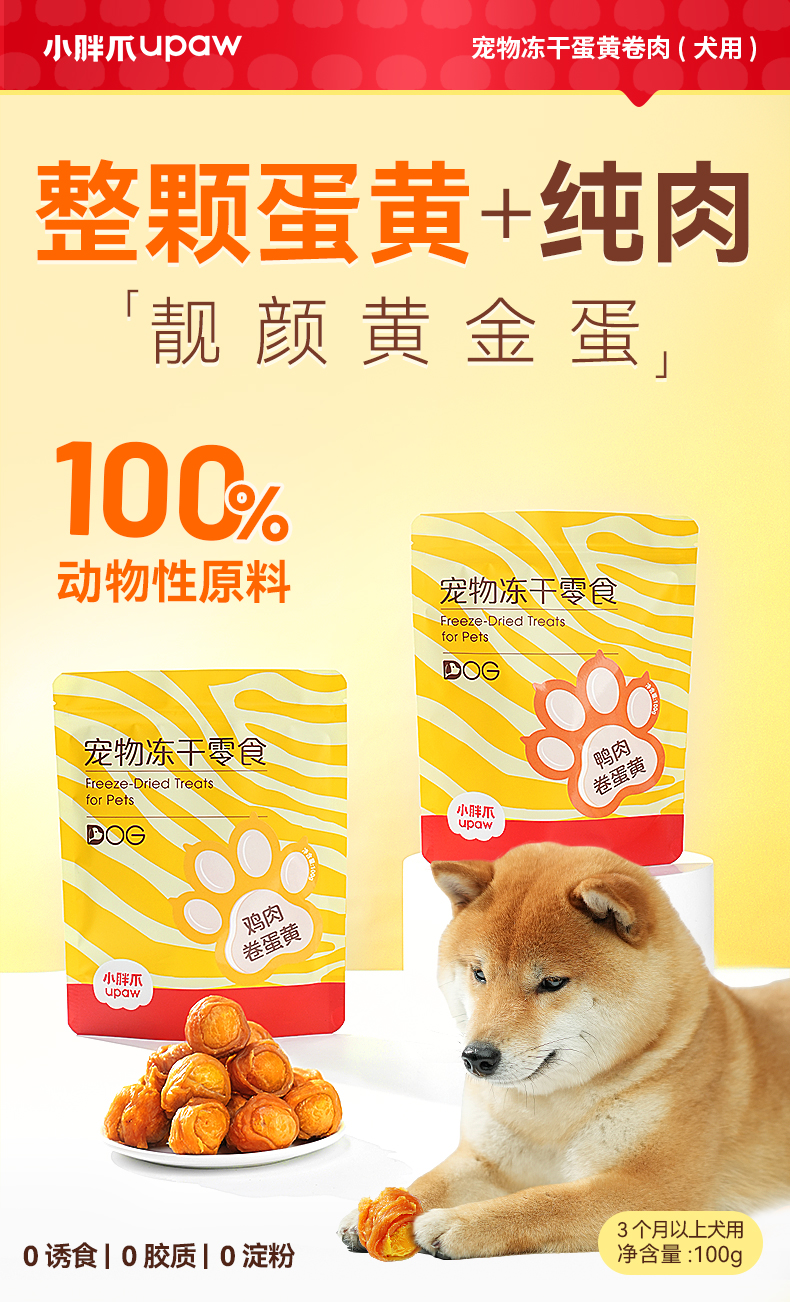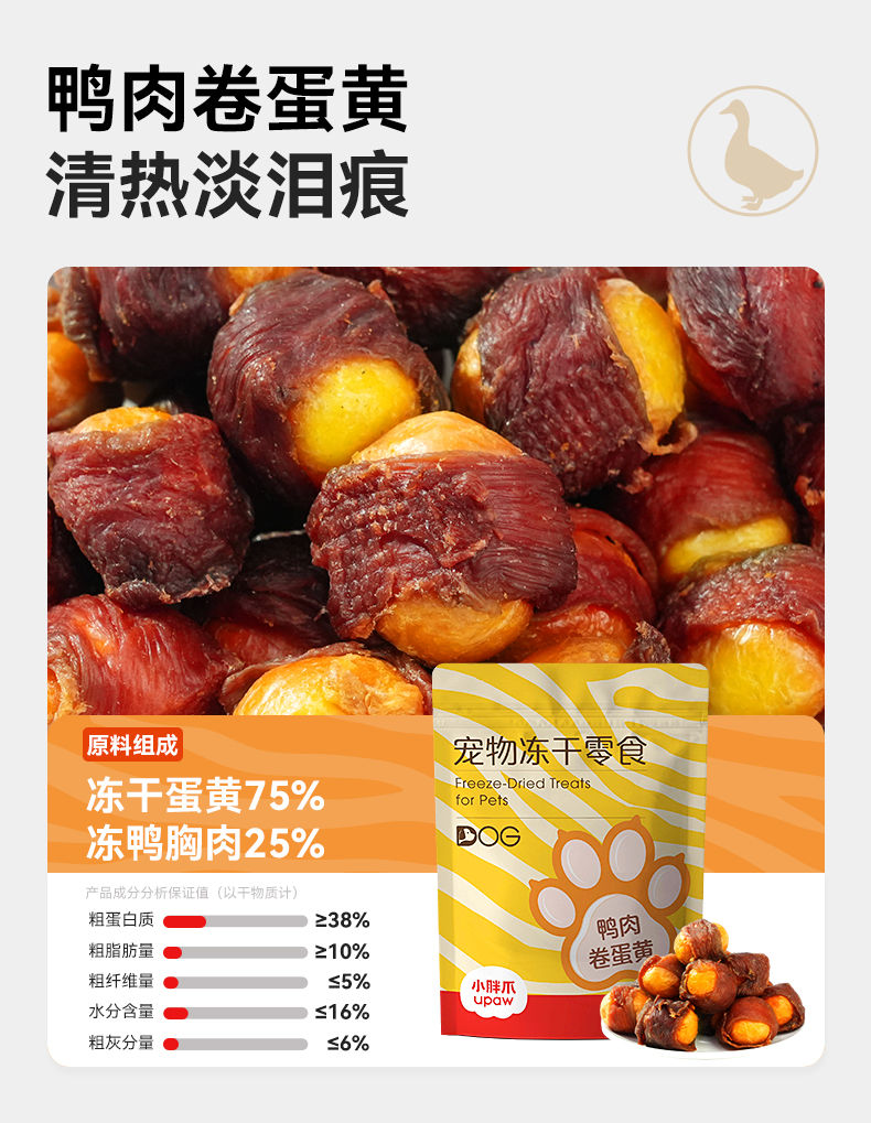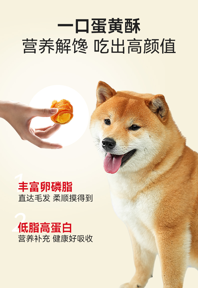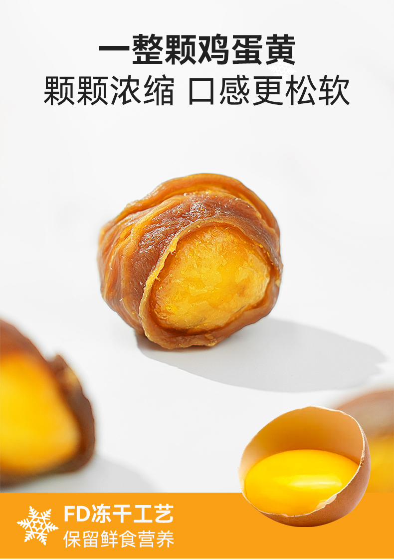 75%冻干蛋黄+25%鸡/鸭胸肉 100%动物性原料,安心可溯 采用一整颗天然蛋黄,丰富卵磷脂,滋养毛发 0肉粉|谷物|诱食|色素|香精添加 粗蛋白质≥38% 粗脂肪≥10%